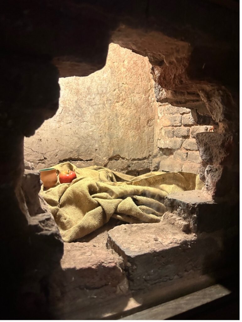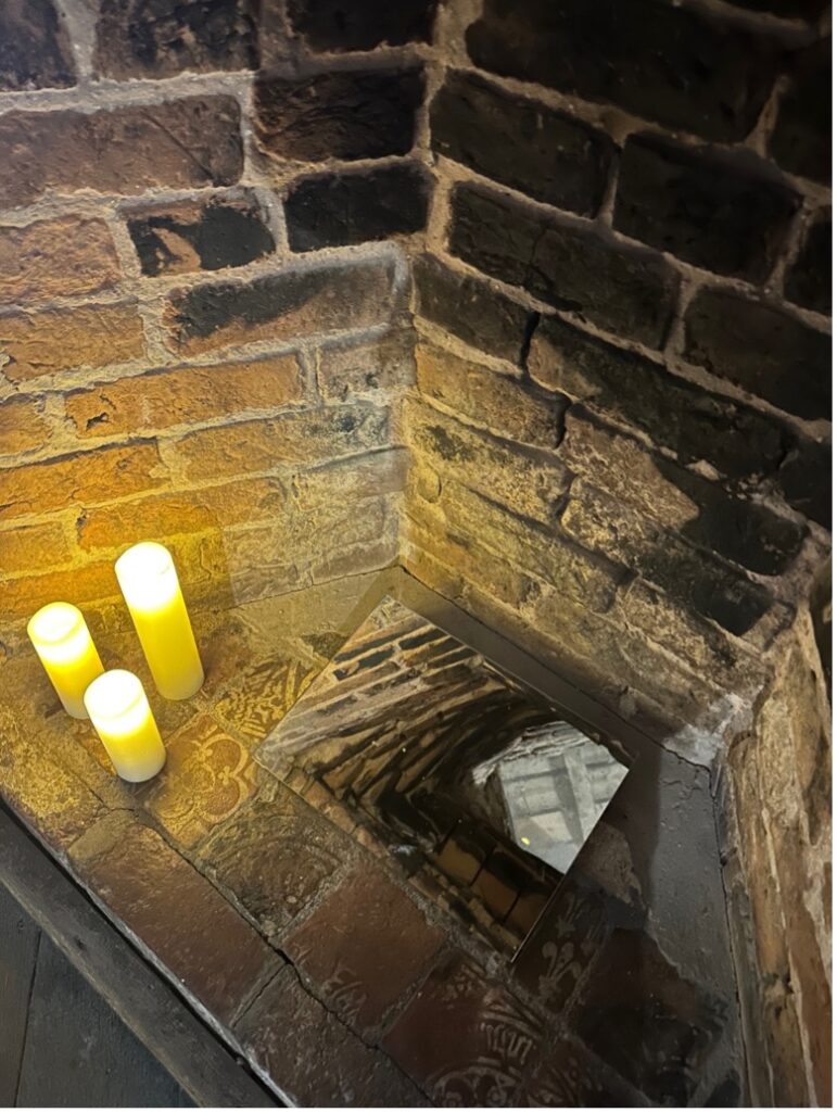 It wasn’t until 2024, though, that I had the privilege of traveling to England and touring Harvington Hall. As soon as I passed over the bridge and entered the red-brick courtyard, I knew that no matter how much research I had done previous there was no substitute for walking where my characters might have walked to get the story right. And as I shimmied into a particularly small priest hide, I gained the knowledge and experience I needed to tell this story in a way it deserved to be told.